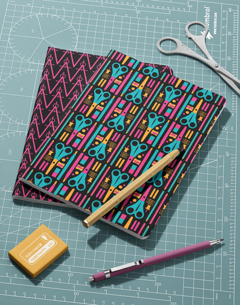 The collection includes a wide range of patterns featuring stationery essentials and office tools. Scissors, pens, compasses, and other practical helpers are reduced to graphic elements and arranged into structured, geometric compositions. This sense of order is intentionally balanced by looser designs with expressive ink splashes, as well as a joyful, colorful hero pattern that adds movement and visual contrast.