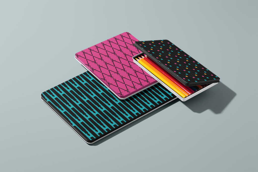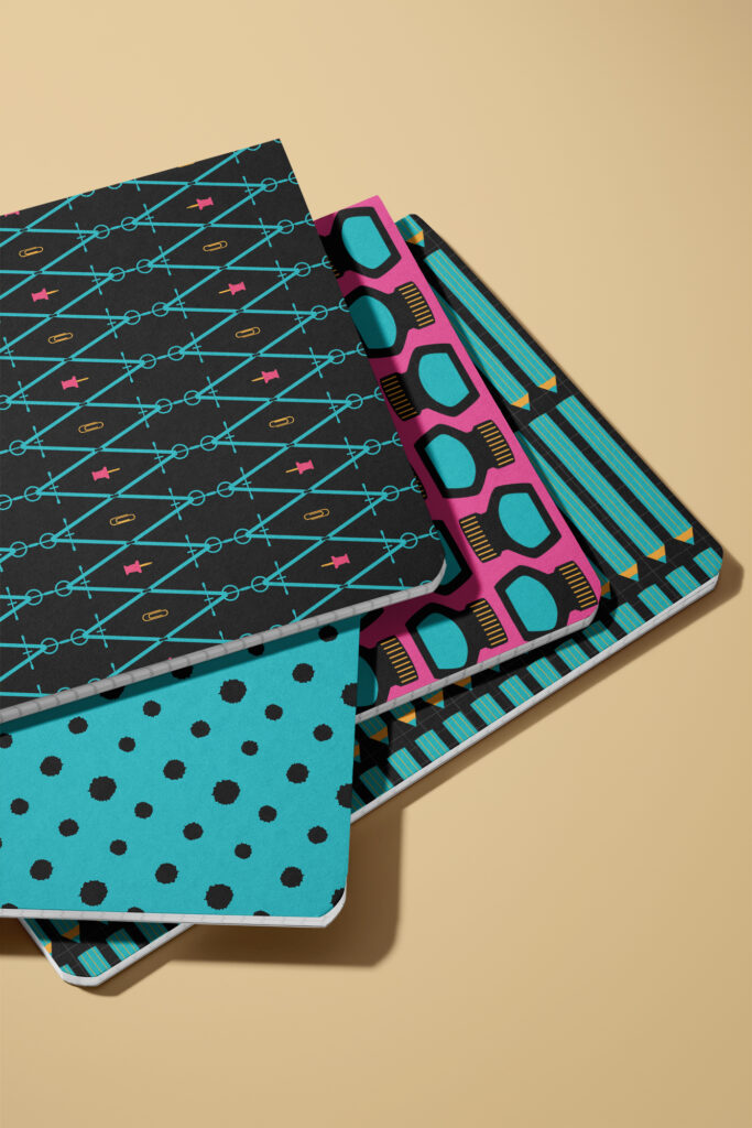 With Neon Notes, I explored a noticeably different creative process than usual. This collection developed primarily in a digital way, with only a few initial sketches and scattered ink splashes as a starting point. The inspiration came from a fascination with stationery — fountain pens, pens, and the small everyday tools that shape how we write, work, and organize ideas. With its fresh neon palette and clear graphic language, the collection naturally connects to back-to-school themes while remaining versatile well beyond the season.